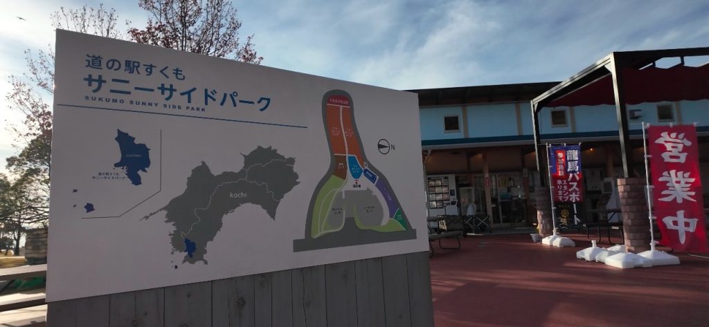 道の駅 すくも サニーサイドパークは、宿毛和田ICから約5kmの海沿いに位置しています。広い駐車場があり、車でのアクセスも便利です。