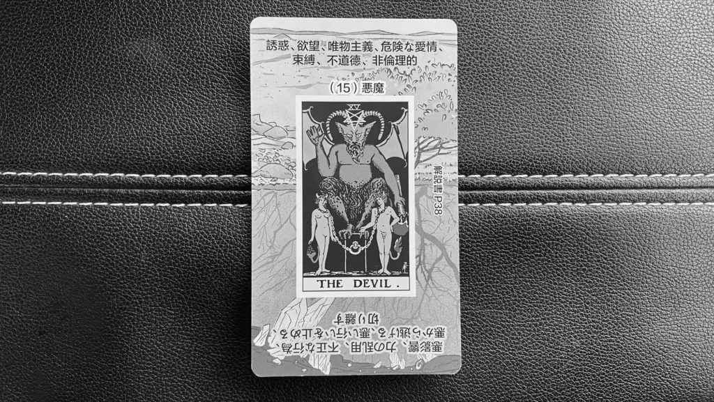 悪魔の正位置は、欲望・執着・依存・誘惑・快楽・抜け出せない関係を象徴します。美味しいもの、楽しいこと、恋、性、お金、地位…“欲しいもの”が強すぎて、自分を縛ってしまう状態とも言えます。