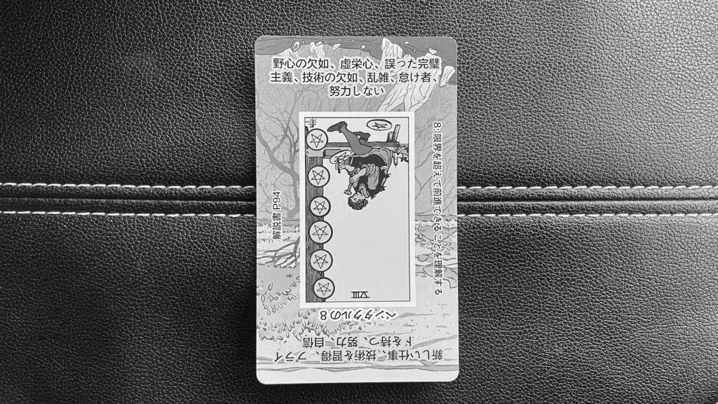ペンタクルの8逆位置は、集中力の低下・やる気の失速・マンネリ・努力が空回り・飽き・義務感を象徴します。本来は「コツコツ積み重ねる」カードですが、逆位置では努力しているのに満足感がない、または「やらなきゃ」という気持ちに押されて楽しさ・目的・情熱が見失われている状態。「自分でも分かっているけど手が動かない」そんなモヤつきも。