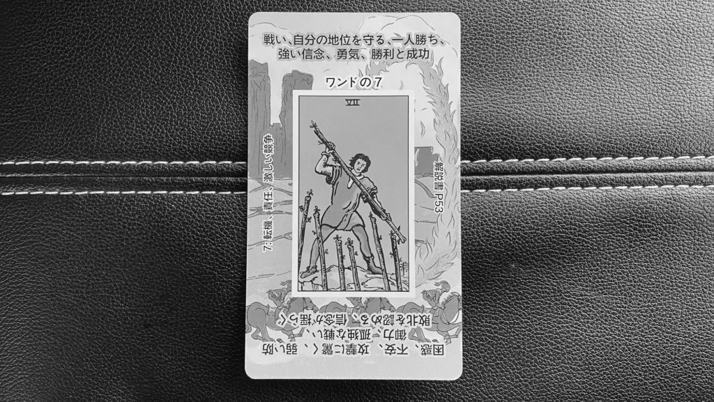 ワンドの7(正位置)は、「守るべきものを力強く守る」「自分の立場を貫く」「困難への勝利」を象徴します。今のあなたは、すでに高い位置・成果・信念を手にしつつあり、それを守るために挑戦やプレッシャーに立ち向かう局面にいます。しかし同時に、あなたは勝てる力を持っているという強い暗示もあります。