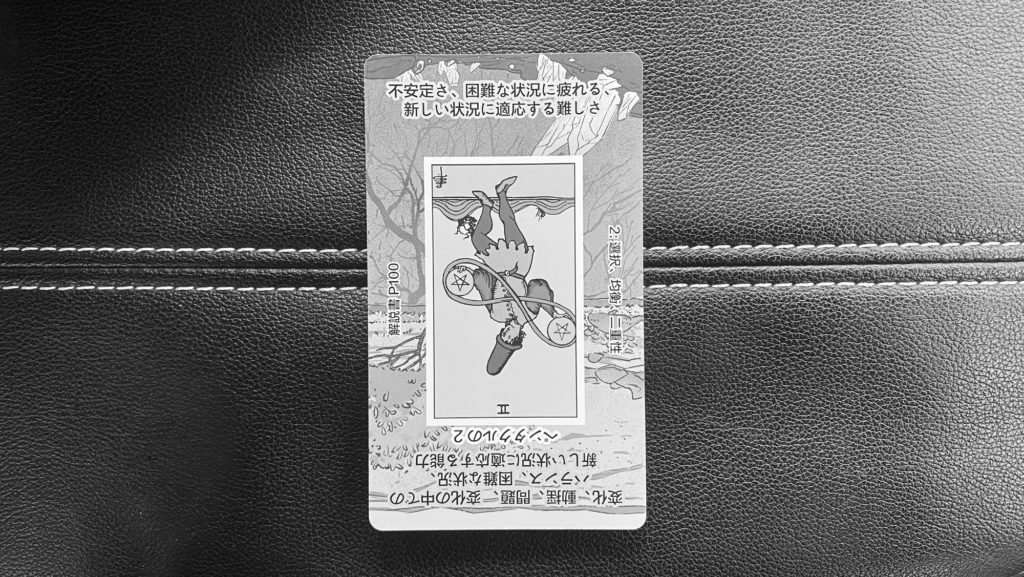 ペンタクルの2(逆位置)は、「バランス崩壊」「同時進行の限界」「優先順位の見直し」を表します。正位置では器用にやりくりできますが、逆位置では、抱えすぎている。あちこちに気を取られて疲弊。もう回らないのに頑張っているという状態を示します。