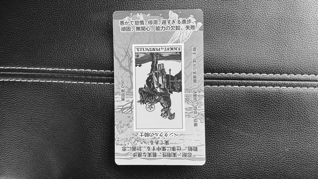 ペンタクルの騎士・逆位置は「停滞」「惰性」「融通の利かなさ」「進まない努力」 を象徴します。今日は「続けるべきか、変えるべきかを見直す日」。頑張っているのに手応えがないなら、努力量ではなく 方向や方法 を疑ってみてください。一度立ち止まり、「本当に今のやり方でいいのか?」と問い直すことで、流れが戻ります。