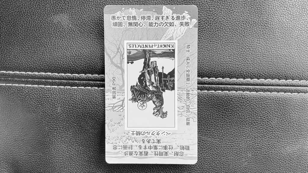 ペンタクルの騎士逆位置は、「停滞」「惰性」「頑固さ」「マンネリ」 を象徴します。本来は「堅実さ」のカード。逆位置ではそれが 重さ・固さ になっています。今日は、「やり方を少し変える日」。間違ってはいない。でも、今の方法が最適とは限らない。コツコツ続ける姿勢は大事ですが、小さな改善・小さな変化 を加えることで流れが動きます。