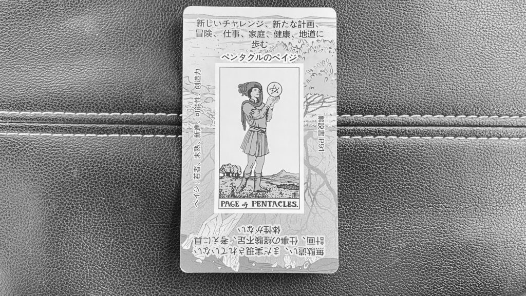 ペンタクルのペイジは、「学び」「基礎固め」「堅実なスタート」「可能性の芽」 を象徴します。派手さはないけれど、確実に未来へつながる一歩。今日は、「真面目さが光る日」。小さなことを丁寧に。基礎・確認・準備を大切にすると運気が安定します。大きな成功よりも堅実な前進 がテーマ。