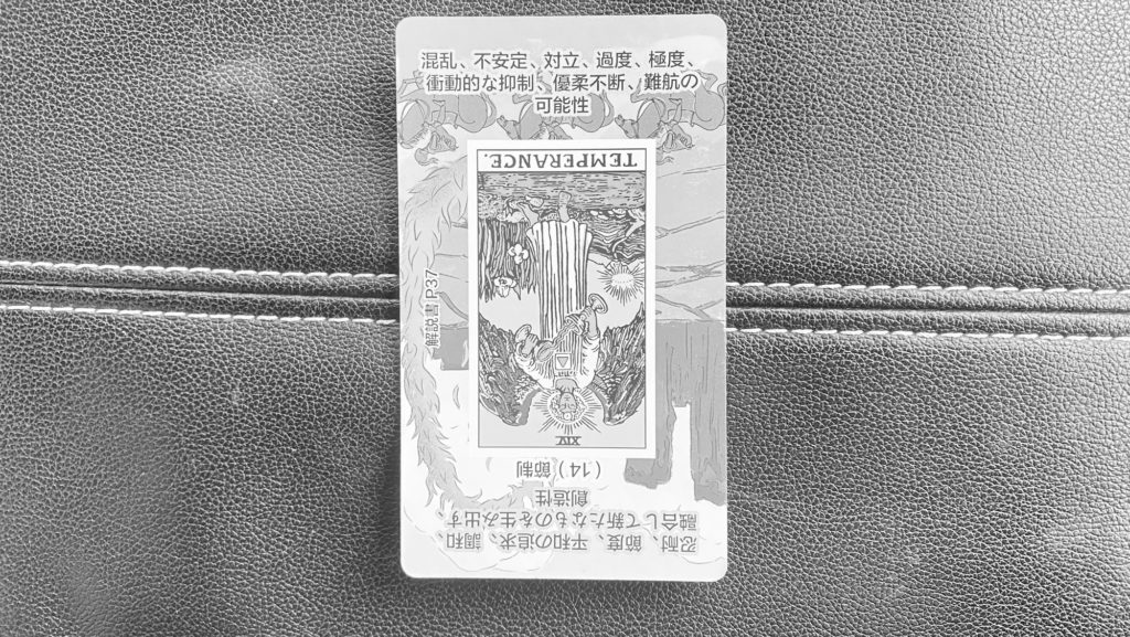 節制の逆位置は、「アンバランス」「やりすぎ/やらなさすぎ」「極端」「調和の乱れ」 を象徴します。本来の「調和」が崩れている状態。今日は、「整え直す日」。頑張りすぎていませんか?逆に、だらけすぎていませんか?0か100かではなく、“ちょうどいい” を探すこと が鍵。