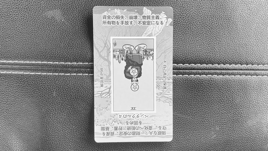 ペンタクルの4逆位置は、「手放し」「執着の緩み」「浪費」「不安定さ」 を象徴します。正位置が「守る」なら、逆位置は 緩める/崩れる の両面があります。今日は、「握りしめているものを見直す日」。それはお金かもしれない。立場かもしれない。こだわりやプライドかもしれない。手放すことで軽くなるのか、それとも不用意に失うのか。そこが分かれ道。
