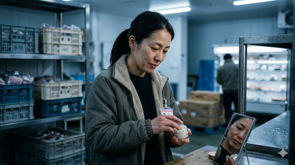 今日はシワ対策の日。正直、最近までシミやシワなんて気にしたことはなかった。けれど、夜のチルド作業を始めてから変わった。乾燥した空気の中で働くうちに、気づけば一気にシワが増えてきた。特に気になるのは、ほうれい線。ふとした瞬間に鏡を見ると、少しだけ現実を突きつけられる。今さらながら、保湿クリームを塗って出勤するようになった。昔なら考えもしなかった習慣だ。でも、これも今の自分に必要なことなんだと思う。大きく抗うわけじゃない。ただ、少しだけ整えていく。それくらいが、ちょうどいい。